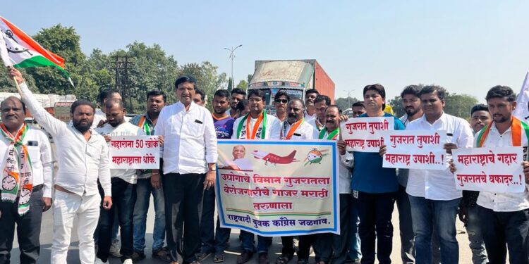 जळगाव राजमुद्रा – राष्ट्रवादी युवक काँग्रेस जळगाव महानगर च्या वतीने आकाशवाणी चौक , जळगाव येथे महाराष्ट्राचे उद्योग गुजरातच्या घशात घालणाऱ्या शिंदे फडवणीस सरकारच्या विरोधात “उद्योगाचे विमान गुजरातला बेरोजगारीचे गाजर मराठी तरुणाला” हे आंदोलन करण्यात आले . वेदांता फॉक्सकॉन , टाटा एअरबस हे प्रकल्प महाराष्ट्रातून गुजरात राज्यात स्थलांतरित झाल्या बद्दल तसेच युवकांच्या पोलिस भरतिवर स्थगिती आणल्या बद्दल व युवकांना रोजगाराचे खोट्या आश्वासनांचे गाजर दिल्याबद्दल सदरचे आंदोलन करण्यात आले .