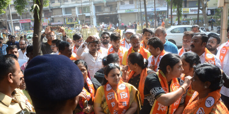 शहरातील गोलाणी व्यापारी संकुलातील पक्षाच्या कार्यालयापासून महापालिका इमारतीसमोरून निदर्शन करीत मोर्चा काढण्यात आला. मोर्चात महापौर जयश्री महाजन, सहसंपर्कप्रमुख गुलाबराव वाघ, जिल्हाप्रमुख विष्णू भंगाळे, पाचोरा येथील पक्षाच्या नेत्या वैशाली सूर्यवंशी, मंगला बारी, उपमहापौर कुलभूषण पाटील, महानगरप्रमुख शरद तायडे, जिल्हा संघटक गजानन मालपुरे यांच्यासह पक्षासह विविध आघाड्यांचे पदाधिकारी, कार्यकर्ते मोठ्या संख्येने सहभागी होते.