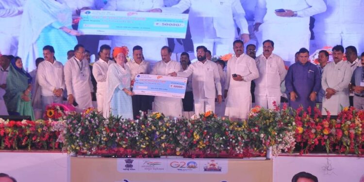 ‘शासन आपल्या दारी’ अभियानात पाचोरा – भडगाव तालुक्यातील ५० हजार लाभार्थ्यांना योजनांचा लाभ देण्यात येत आहे‌. असे नमूद करून मुख्यमंत्री श्री शिदे म्हणाले, नैसर्गिक आपत्तीच्या काळात शासन शेतकऱ्यांच्या पाठीशी खंबीरपणे उभे आहे. शेतकऱ्यांना वाऱ्यावर सोडले जाणार नाही. ‘शासन आपल्या दारी’ कार्यक्रमात आतापर्यंतच्या १४ कार्यक्रमातून १ कोटी ६१ लाख लाभार्थ्यांना लाभ देण्यात आला आहे. राज्य शासनाला केंद्र शासनाचे नेहमीच पाठबळ असते. राज्यातील सहकारी साखर कारखान्यांना दहा हजार कोटींचा करमाफी देण्याचा निर्णय केंद्र शासनाने घेतला आहे. ‘शासन आपल्या दारी’ अभियानाच्या माध्यमातून शासन गतिमान झाले आहे. महिला सक्षमीकरणासाठी शासनाने अनेक उपक्रम, योजना राबविल्या आहेत. शासनाने अनेक प्रलंबित प्रकल्पांना गती देण्याचे काम केले.असे नमूद करून मुख्यमंत्री श्री.शिंदे म्हणाले की, महिलांना एसटीत ५० टक्के सवलत, ज्येष्ठांना मोफत प्रवास , शेतकऱ्यांना नमो सन्मान योजनेत वर्षाला १२ हजार रूपयांची मदत दिली जात आहे. एक रूपयात पीक विमा क्रांतीकारी योजना आहे. शासनाने एनडीआरएफच्या निकषापेक्षा जास्त मदत शेतकऱ्यांना दिली आहे. नैसर्गिक आपत्ती पूर्व सूचना देणारे सॅटेलाईट शासन उभारणार आहे. यावर्षी पाऊस कमी पडला ही वस्तुस्थिती आहे. मात्र सरकार शेतकऱ्यांच्या पाठीशी आहे. जी-२० परिषदेत भारताचा ठसा उमटविण्याचे काम पंतप्रधान नरेंद्र मोदी यांनी केले. शासनाने ३५ जल सिंचन प्रकल्पांना सुधारित प्रशासकीय मान्यता दिली असून त्यामुळे ८ लाख हेक्टर क्षेत्र सिंचनाखाली येणार आहे, असे मुख्यमंत्री श्री शिंदे यांनी सांगितले.