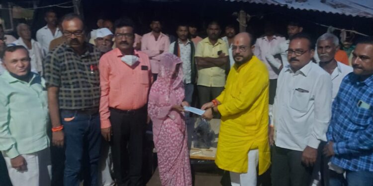 शासनाच्या नैसर्गिक आपत्ती योजनेअंतर्गत स्व. भागवत पाटील यांच्या वारस पत्नी श्रीमती मालुबाई भागवत पाटील यांना चार लाख रुपयांचा धनादेश पालकमंत्री गुलाबराव पाटील यांच्या हस्ते प्रदान करण्यात आला. यावेळी पं. स. सभापती प्रेमराज पाटील, माजी उपसभापती डी.ओ. पाटील, विधानसभा क्षेत्रप्रमुख संजय पाटील, तहसीलदार नितीनकुमार देवरे, जिल्हा परिषद सदस्य गोपाल चौधरी व ग्रामस्थ उपस्थित होते.