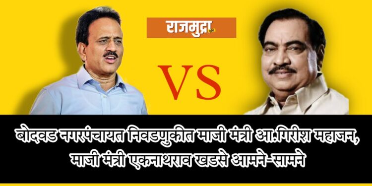 बोदवड राजमुद्रा वृत्तसेवा | जिल्ह्यातील बोदवड तालुक्यातील नगरपंचायतीच्या निवडणुकीच्या पार्श्वभूमीवर राज्यांतील दिग्गज नेते असलेले माजी मंत्री एकनाथराव खडसे,माजी मंत्री आ. गिरीश महाजन यांच्यात टिक्का-टिप्पणी चा जोरदार कलगीतुरा रंगला आहे. बोदवड नगरपंचायत दोघांनी प्रतिष्ठेची केल्याने दोघांनी विजयासाठी कंबर कसली आहे. गिरीश महाजन यांनी थेट खडसेंवर निशाणा साधला, मुख्यमंत्रिपदाच्या शर्यतीसाठी पळतो, अन् स्वतःच्या मतदारसंघाचा विकास मात्र भक्कास आणि म्हणे मोठा नेता, अशी टीका माजी मंत्री गिरीश महाजन यांनी नगरपंचायत निवडणुकीनिमित्त आयोजित प्रचार सभेत राष्ट्रवादी काँग्रेसचे नेते एकनाथ खडसेंवर केली आहे. यामुळे जिल्ह्यातील राजकीय वातावरण चांगलेच तापले आहे.