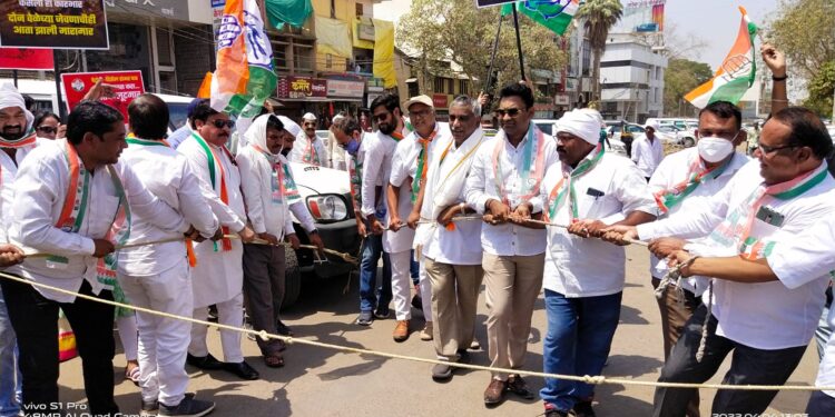 त्यानुसार आज जळगाव जिल्हा काँग्रेस च्या वतीने महाराष्ट्र प्रदेश काँग्रेसचे उपाध्यक्ष मा खा डॉ उल्हास पाटील यांच्या नेतृत्वाखाली व जळगाव जिल्हा काँग्रेसचे जिल्हाध्यक्ष प्रदीप पवार व युवक काँग्रेस जिल्हाध्यक्ष देवेंद्र मराठे यांच्या प्रमुख उपस्थितीत शाश्री टॉवर येथे महंगाई मुक्त भारत आंदोलनाअंतर्गत पेट्रोल- डिझेल- गॅसच्या रोजच्या दरवाढीमुळे वाहनांना दोर बांधून “ढकल गाडी आंदोलन” करून आगळ्या वेगळ्या पध्दतीने मोदी सरकारच्या निषेध केला…..