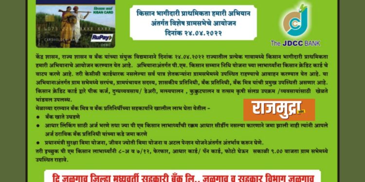 जळगाव राजमुद्रा दर्पण | भारतीय स्वातंत्रयाच्या अमृत महोत्सव वर्षातर्गत आत्मनिर्भर भारताचा एक भाग म्हणून केंद्र शासनाने प्रधानमंत्री किसान सन्मान निधी योजनेच्या सर्व पात्र लाभाथ्यांना किसान क्रेडिट कार्ड उपलब्ध करुन देण्यासाठी दि. २४ एप्रिल, २०२२ ते १ मे, २०२२ या कालावधीत किसन भागीदारी प्राथमिकता हमारी या मोहीमेचे आयोजन करण्यात आले आहे. या मोहिमेत प्राधान्याने प्रधानमंत्री किसान सन्मान निधी योजनेच्या सर्व पात्र शेतकऱ्यांना किसान क्रेडिट कार्ड (KCC) उपलब्ध करुन देण्यात येणार आहे. या मोहिमेचा जिल्ह्यातील सर्व शेतकऱ्यांनी लाभ घ्यावा, असे आवाहन जिल्हाधिकारी श्री अभिजीत राऊत यांनी केले आहे.